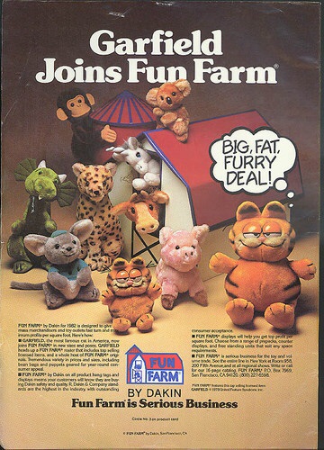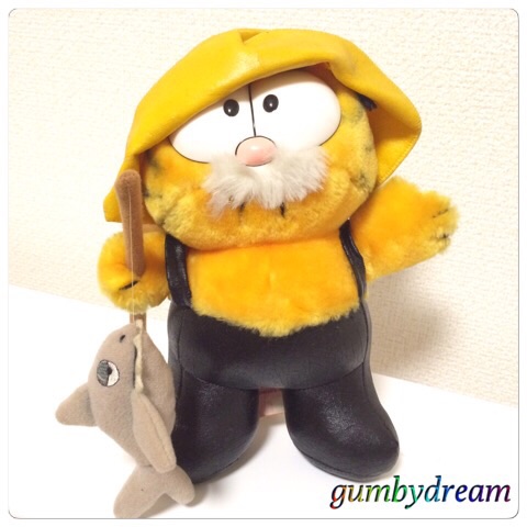 2015/06/24 Category : GARFIELD Fisherman Garfield 1980s 今日からはPhoenixのThe Brass Armadillo Antique Mallからいらしゃった方々の紹介となります。まずトップバッターは猟師姿のガーフィールドさんのPlush Toy。すごいインパクトですよね。ちょっと観察してみましょう。まずはお顔。よく見ると白いお髭をたくわえておいでです。なかなかヒゲ面のガーフィールドさんってお見かけしませんよね。そして黄色いラバーの帽子にラバーのパンツという西洋風猟師さんのコスチューム。脱げるわけではなく完全に縫い込まれている状況です。そして右腕には釣竿と魚?サメ?。おや?この釣竿にサメというのはどっかで見た事ありますよね。そうです、以前にご紹介したラスベガスからいらっしゃったカナダのイヌイットさん仕様のガーフィールドさんもこの釣竿とサメを持ってましたっけ。同じ時期のプロダクトなのかもしれません。イヌイット仕様のガーフィールドさんタグにはFun Farm by Dakinの文字。Dakinのタグ研究を続けるオッさんですが、これまでR.Dakin & Companyと書かれているのが1987年以前で、それ以降はDakin.Incという見分け方しかしていませんでしたので、このFun Farmというキーワードで調べてみました。米国の商標登録資料を検索したところ、1975年11月18日にR.DAKIN & COMPANYが商標登録をしていました。きっとDAKIN社のヌイグルミのブランドの1つだったんでしょう。数々の動物たちのヌイグルミをリリースしていたようです。さらに調べていたら面白いポスターを見つけました。拡大すると文字がつぶれてしまうので何が書かれているのかはわかりませんが、見出しからするとFun Farmというシリーズにガーフィールドさんが加わった時のポスターのようです。下段にFun Farm is Serious Businessと書かれています。「Fun Farmは真剣な取り組みです」という意味なら何か慈善的な事業だったのかもしれませんが記録が残っていないので何とも言えません。このFun Farmのタグが付いているガーフィールドさんは東京の家にもいらっしゃいます。以前ご紹介した我が家のニューメキシコからいらっしゃったガーフィールドさんとフェニックスからいらっしゃった大きなアーリーンさんです。ニューメキシコから来たガーフィールドさんでかいアーリーンさんまたひとつ勉強になっちゃいましたね。引き続きDAKIN社の研究を続ける事にします。あ、Fun Farmを調べている時にみつけたポスターをもう1枚。以前にご紹介したLove Struck!というTシャツを聞いたガーフィールドさんの正体。バレンタインの時にガーフィールドさん付きの花を贈るというプロモーションがあったようです。Love StruckのTシャツを着たガーフィールドさん我が家のガーフィールドさんも誰かが愛する人からバレンタインの花と一緒にもらったんでしょうね。後々、アンティークショップに売られちゃたわけですからちょっと悲しい物語ですが、ちゃんとオッさんが保護して他のガーフィールドさんと仲良く暮らしてますのでハッピーエンドってことにしておきましょう。さてさて近況報告。またまたサクランボを頂いちゃいました。サクランボはシーズンが限られているので集中しちゃうんですよね。これも美味しくいただこうと思います。GARFIELD1972,1981 UNITED FEUTURE SYNDICATEM INC.FUN FURM NY DAKINSAN FRANCISCO,CAPRODUCT OF KOREA.PA REG, NO,118$14.99 ©2011-2015 GUMBYDREAM Created with flickr badge. http://