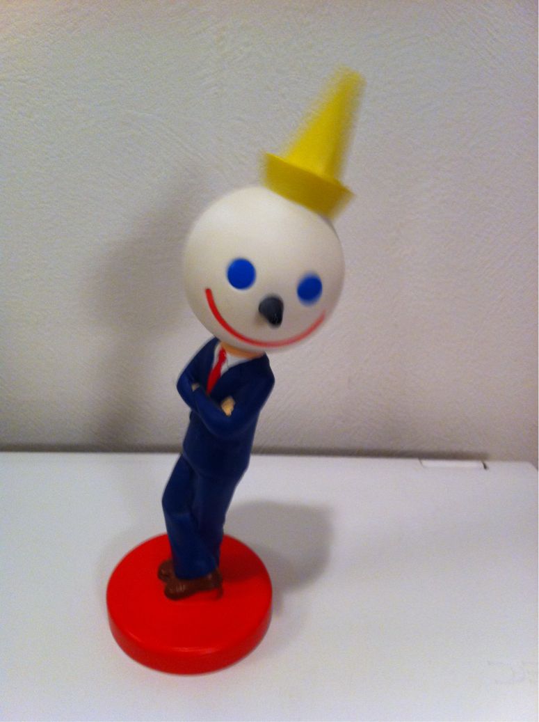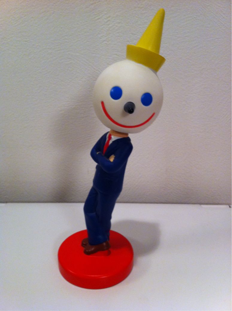 2011/09/28 Category : JACK IN THE BOX JACK IN THE BOX BOBBLE-HEAD 2000s 2003年製CEOジャックのBOBBLE-HEADです。オアフのKalakaua Ave.とNiu St.の角にあったJack In The Boxからいらっしゃいました。今は無くなってしまい、2011年現在では調剤薬局になってました。ハワイ滞在中は食べたいプレートランチがたくさんあり、Jackでハンバーガーを食べることは無いため、ほとんどのJackさんはアンティークショップからいらっしゃいます。ただ、このJackさんはハンバーガーとのセットではなく、単品販売があったため、店舗で購入したものです。日本人のおっさんが、ハンバーガーを注文せず、このJackさんを指差して、「それだけちょうだい!」と言ってる様は、さぞ、店員さんもビックリしたことでしょう。BOBBLE-HEADとは首振り人形のことです。首を振っているところを撮ってみましたが伝わりますでしょうか…Mfg. For JACK IN THE BOX RestaurantMade in China ©2011-2015 GUMBYDREAM Created with flickr badge. http:// PR Comment0 Comment Comment Form お名前name タイトルtitle メールアドレスmail address URLurl コメントcomment パスワードpassword