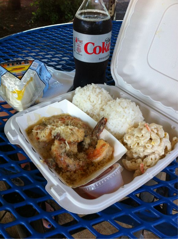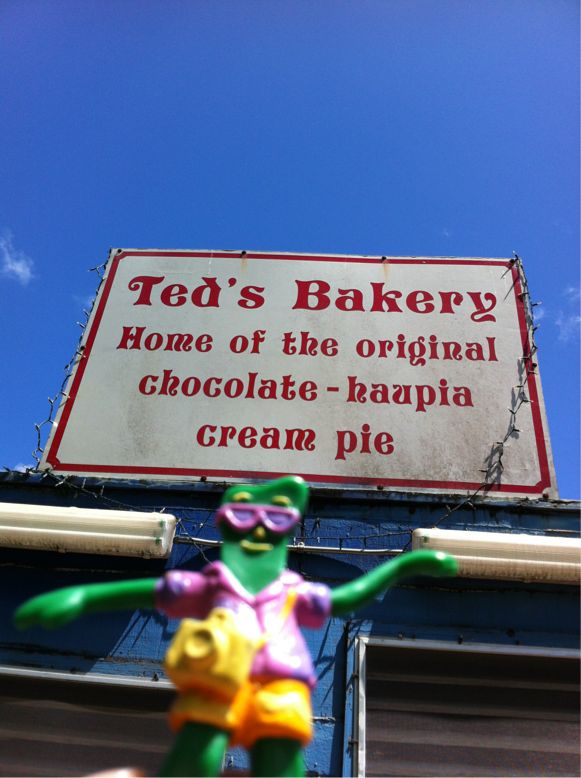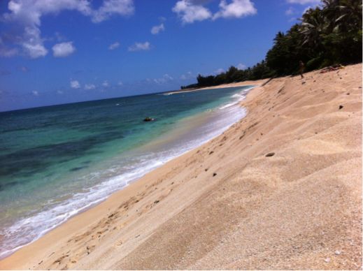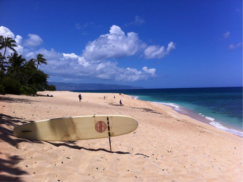 2012/08/26 Category : オッさんの旅日記(海外編) 2012Summer Day8 "North Shore" ハワイ8日目ともなると、もはやここが日常となってきます。いい感じですねぇ。今日は妻も早起きをしてノース・ショアーへドライブです。オアフ滞在が短いと、どこのビーチへ行こうかと悩みますね。オッさんと妻の選択は迷いもなくノース・ショアです。朝食はまたもやDiamond head market & Grillに行って、美味しいと評判のブルーベリー・チーズ・スコーンとスパム・ゴマ・ムスビを購入です。ドライブしながらムシャムシャと食べるんです。このスコーンは噂通りに美味い!ちょっと大きいなと思うのですが、美味しいのでペロリと食べちゃえます。一緒に買ったスパムムスビも美味い。ゴマを効かせてるのはここだけかも。アラワイ運河に沿って進み、マッカリー通りを右折、キング通りを超えてH1に乗ります。H1の乗り方には色々あるとは思いますが、オッさんと妻はこの乗り方を何年も続けているので、WAIKIKIに滞在してなくてもこのコースになっちゃいます。H1からH2を経てズンズン北へ進みます。ノース・ショアには有名なビーチがたくさんあります。オッさんと妻も若い頃はワイメアがノースのNo1だと信じて疑わなかった頃がありますが、ワイメアは混んでいて駐車場に止めるのも苦労をするし、ビーチが大きくて水際まで行くのに疲れるし、木陰というものが存在しないのでパラソルでも持っていかない限り太陽ギンギンの中で過ごさなければいけないし…。ワイメアの海の透明度と独特な静寂感、そして景色の良さは捨てがたいものがあるのですが、オッさんと妻は歳を取ってしまったのでしょう。少々辛くなってしまったのです。サンセット・ビーチも人気のビーチですね。オッさんたちはサンセット・ビーチで過ごしたことは無いのですが、夕方までいればサンセットがキレイなのでしょうか?でも、サンセットはWAIKIKI側がキレイですよね?方角どうなってるんだろ?な〜んて考えますが、オッさんたちは夕方までノース・ショアに居ることはセキュリティーの面から考えて避けてるんで、結局、サンセット・ビーチには行かないのです。オッさんたちのお気に入りビーチはEhukai Beach。ここは駐車場、ライフガード、トイレという最低限のインフラが備わってるのにもかかわらず、観光客にはマイナーなビーチなのか、人が少ないのが最大の魅力。駐車場も簡単に停められるし、木陰もあるし。海は澄んでいてとても綺麗ですが、遠浅ではなくビーチからストンと深くなるタイプのビーチなので泳ぐのに勇気はいりますけどね。まぁ入っちゃえばどうってことありませんけど。このビーチは本当に癒されます。オッさん的にはここがパワースポットですね。なんかよくわからなけど、心地よい時間が流れて行くのです。ビーチに来るとオッさんたちはノンビリと3時間くらい過ごします。オッさんは泳いだり、本を読んだり。妻は泳ぐというかプカプカ浮いてたり、フリーペーパー読んだり、寝てたり…。オッさんは静かなビーチで青空と海を背景に本を読むのが好きな時間です。オッさん目線で見るとこんな感じです。実はオッさんには長年連れ添っているビーチの相棒がいます。それは「敷物君」。1989年に友人と北米をグルグルとまわる旅をしていた時に、サンタモニカの露天のオッさんから買ったものです。こいつがなんとも具合が良く、ビーチに行く旅の時はかならず連れてきてます。かれこれ23年の付き合いということでしょうか?これからもヨロシクね。さて、昼過ぎにはビーチを去り、昼食を取りにTed's へ。最近は日本でもTed'sのパイが食べられるようになってしまったので、パイはありがたみに欠ける感じがしますが、オッさんがここに来る目的はパイではありません。ガーリック・シュリンプのプレートランチを食べるためなんです。ちょっと先のカフクに行けばエビの養殖場があるので、その場で美味しいエビを食べさせる店があるのですが、オッさんはTed'sのガーリック・シュリンプがNo1だと信じで疑いません。日本人の観光客もポツポツいますが、皆さんパイを食べに来てます。「違いますよ〜、シュリンプ食べた方がいいですよ〜、しかもプレートランチにはパイがサービスで付いてくるから、お得でもありますよ〜」と教えたくなっちゃいますが、皆さん、楽しい夕食のためにお腹を空けておくのかもしれないし、お節介はやめておきましょう。帰路も寄らなくてはならないところがてんこ盛りです。まずはハレイワ。マツモト・シェーブアイスはすごい行列です。昔は寄ったんですけねぇ。松本おじいちゃんと写真を撮らせてもらったこともありましたっけ。まだご存命なのかなぁ?とにかく行列店はスルーします。ノースショア・マーケット・プレイスにあるCoffee Galleryで一息つきます。ここは裏庭みたいなところがあって実は素敵なポイントなんです。コーヒーの専門店ということもあってコーヒはすごく美味しいですよ。帰り道い