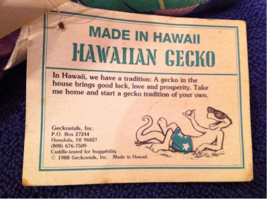 2012/03/02 Category : HAWAII Hawaiian Gecko 1980s 1987年製のGECKOさんです。1987年製ですが、1992年にオアフ島からいらっしゃいました。多分、ABCストアで出会ったのではないかと思います。1987年から1992年の空白の期間はなんでしょうか?5年間もABCの店頭にいたのか?倉庫に留まっていたのか…いずれにせよ我が家にくるまでの間、辛い時代があったのでしょう。このGECKOさんは我が家でイリマさんと呼ばれています。出会った時に泊まったホテルがILIMA HOTELだったからです。20年前の話ですからインターネットとかで旅行の予約をとったりしません。妻と安いツアーを探してたまたま激安だったので予約を入れたのですが、ILIMA HOTELがアパートメントを改造して開業したばかりだったので、入国審査の時に「そんなホテルは無い」と言われ閉口した記憶があります。ちなみにILIMAというのはハワイの黄色い花の名前で、オアフ島の島花にもなってます。さて、イリマさんはGECKOです。カラフルボディーにレイをかけていますが、実は、腰ミノも付けてました。今となってはボロボロになり見る影もないですけどね。タグをつけたままなので見てみると、MADE IN HAWAIIとなってます。いいですねぇ。タグもなかなか良い感じです。イリマさんはDay Geckoと思われます。Day GeckoというのはGeckoの中でも昼間にウロウロとされている方のことを言うそうです。ロコの方に聞いたから間違いないでしょう。本物のDay Geckoさんはこんな感じです。昨年、ハワイ島のヒロに滞在した際、レンタカーの上をウロウロされていた方です。まぁ、派手さで言えばイリマさんの勝ちですけどね。©1987 Geckostufs, Inc.Made in Hawaii USA with Aloha ©2011-2015 GUMBYDREAM Created with flickr badge. http://