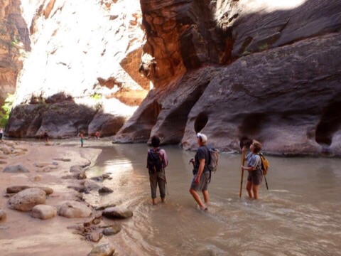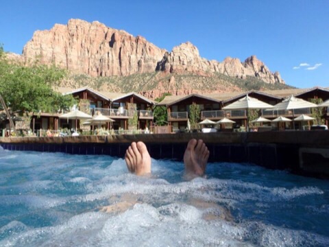 2014/08/09 Category : オッさんの旅日記(海外編) 2014 Summer Vacation in Utah " Day6" Drive & Hike の旅も6日目。今日の朝はZion Lodge。すがすがしいですねぇ。朝起きていきなりZionの岩がドーンとあると、「いやぁ~旅してるなぁ~」って思っちゃいます。今日はシャトルに乗ってハイクするポイントまで連れて行ってもらいます。パーク内にはこの無料シャトルが5分おきくらいに走っていて非常に便利。いちいち車で移動したり駐車場を探さなくて良いですからね。連れて行ってもらったのはTemple of Sinawavaというポイント。National Parkの中心からやや西よりのポイントですが、シャトルで行けるのはここまで。つまり普通に行くと最深部ってことです。ここからRiverside Walkというトレイルを進みます。呼んで字のごとく、川沿いを歩くトレイル。川を上流に向かってあるくのですが、かなりフラットですし、道も整備されていますので、なんてことはありません。Zionは2回目というオッさんと妻の目的は、このEasyなトレイルを歩く事ではありません。今回の企画は「渓流ハイク」。そうです、このThe Narrowsという川というか渓流をどんどん上流に登っていこうという企画なのです。Riverside Walkの終点からはアドベンチャー。まずは簡単な川登り。この辺りだと興味本位で登る軽装のファミリーなんかもウジャウジャしていて賑わってます。しばらくは浅瀬。登る人、下る人でけっこう混雑しています。川岸がある部分は川岸を歩きます。川の中より歩きやすいですけど、石がゴロゴロしていて滑りやすく、決して楽なハイクではありません。しばらく行くと川岸の無い幅の狭いエリアに突入です。水深は膝上くらい、深いところだと太ももくらいまで。流れが穏やかなので何とか前には進めます。上の景色も見たいし、足元も気になるし、大忙しです。上流から帰ってきたファミリーと出会いました。小さな子供もこれだったら楽勝ですね。大ウケしちゃいました。更に上流に行くと両岸の崖が迫ってくるように立ちはだかります。川岸も左岸、右岸と交互にありますので、その都度、川を横切るために川の中を歩くという繰り返し。遠くに高い岩山が見えてくるとダイナミックな光景になります。いやぁ圧巻。川幅が多少広くなると歩きやすいのですが、延々どこまで歩いてよいのかわからなくなってしまいます。1時間30分ほど歩いたところで折り返すことにしました。あまり奥まで行って帰れないなんてシャレになりませんからね。あとは来た道を戻ります。帰りも1時間30分はかかりますから、往復3時間くらいは歩いてたことになりますね。まぁゆっくりですから距離はたいしたこと無いと思いますけど。オッさんと妻はこの川に入るために、ちゃんとウォーキング用のサンダルを持参してきました。なぜなら前回の訪問時、妻がスニーカーで川に入ったら靴底の接着剤が取れてカパカパになっちゃった事件というのがありましたから。オッさんのサンダルとリスさんの2ショットを撮っておきました。せっかくですからリスさんのお食事風景も。リスの写真を撮ってるのは明らかに海外からのツーリスト。米国人は見向きもしません。アジア人も撮りますが欧州人もけっこう喜んで撮ってます。帰りもシャトルに乗りましたが、ロッジに向かう途中のBig Bendというポイントで下車。ここの風景がオッさん的には"THE ZION"じゃないかと思います。シャトルと一緒に撮っても絵になりますねぇ。再びシャトルに乗ってロッジまで帰ります。遅い昼食になりましたがホットドッグとダイエットコーラ。運動の後はどんなジャンク・フードでも美味しく感じるもんです。1泊お世話になったロッジにも「さようなら」のご挨拶。妻はZIONを愛していますから、またお世話になることもあるでしょう。今日の宿泊はNational Parkからちょっと外に出たSpringdaleという街。この街で一番人気のホテル、Desert Pearl Innに宿泊です。これもツアコン妻のセレクション。いったい、どうやって情報を集めてるんでしょうか・・・?さすが人気のホテル。部屋は広々として内装もいい感じです。ミニキッチンも着いてます。冷蔵庫、レンジ、トースターもありますから長期滞在もOKですね。それぞれこだわりぬいた備品って感じでホテル側のやる気が感じられます。バスルームも広々。当然、妻はバスタブのあるホテルしか選びません。バルコニーも広々。しかもコンセントが外にありますので、オッさんは今、このチェアに座ってPCつないでブログ書いているところです。さて、妻がこのホテルを選んだのは、この素敵な部屋だけが理由ということではありません。妻が選んだ最高の演出はこれ。ダーン!大好きな赤い岩山を見ながらのプール!もう最高です。あんまり素敵すぎましたので18時くらいまでずっとプールにいました。更にジャグジーもドーン!もはや露天風呂状態です。19時頃になりましたので、付近のお店に食事に行こうと部屋を出たら、こんなカワイイ車を発見。JOHN DEEREのバギーです