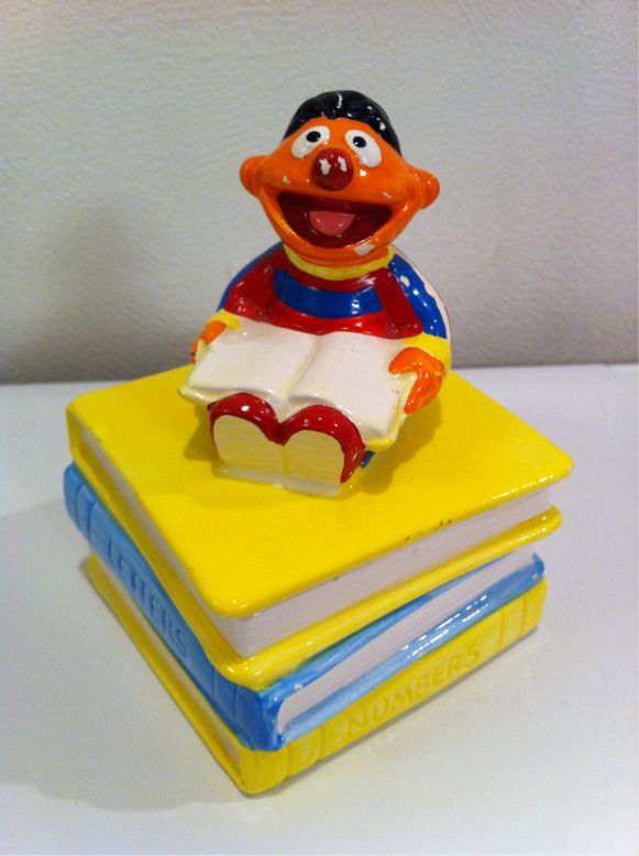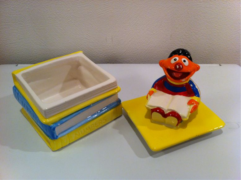 2011/10/18 Category : SESAME STREET ERNIE Trinket Box 1980-1990s ERNIEの陶器製小物入れです。アリゾナ州のSCOTTSDALEのアンティークショップからいらっしゃいました。刻印が無いので、製造メーカーや製造年代が不明です…しかし、オッさんが調べたところ、どうやら1980年〜1990年代初頭のものらしいことが判明しました。これはアメリカのすごいコレクターの方のサイトに書かれていた情報によるものです。この方のコレクションの量と質は圧巻!コレクションもオッさんと被っていますので、今後は勝手に「お師匠さん」と呼ばせていただくことにします。お師匠さんによれば、同様の小物入れでクッキーモンスターとビックバードのバージョンが存在するようです。小物入れの蓋を開けるとこんな感じです。ちなみにアーニーの誕生日は1月28日。アーニーのことがあまり好きではない妻と1日違いです。JIM HENSON PROD . INC . ©2011-2015 GUMBYDREAM Created with flickr badge. http://
