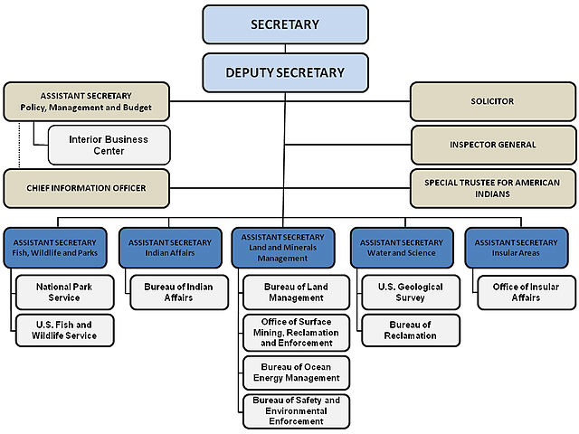 DOIのページを探っていくと組織図がありました。Secretary(長官)、Deputy Secretary(副長官)の下に5人のAssistant Secretary(次官補)がいます。