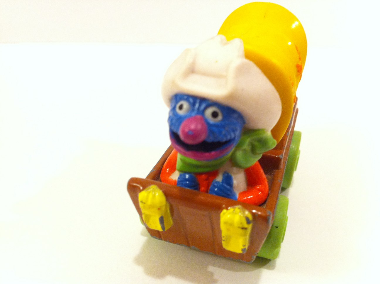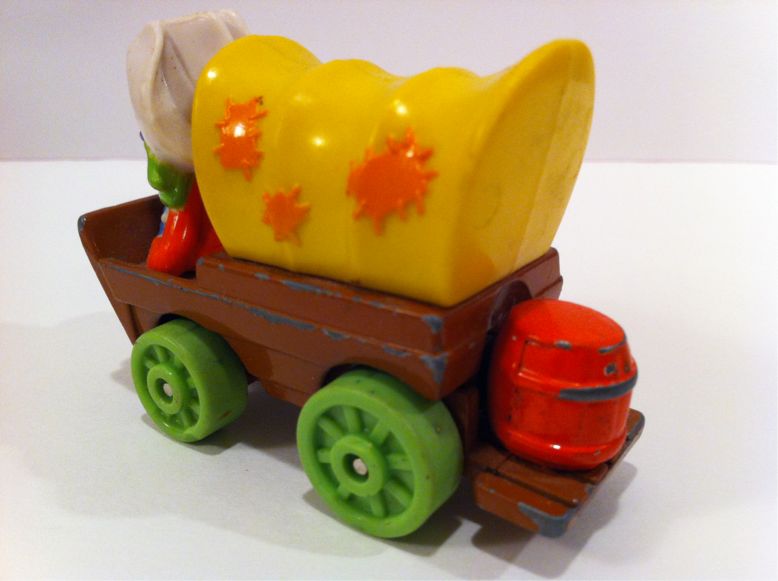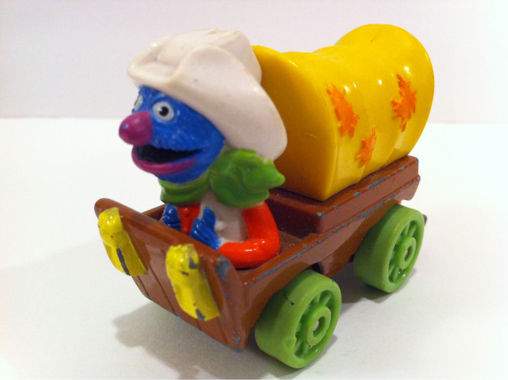 2012/06/21 Category : SESAME STREET Grover Riding Covered wagon 1980s 1987年製でダイキャストの幌馬車に乗るカウボーイ・ファッションのグローバーさんです。これもアリゾナ州ツーソンのChristine's Curiosity Shopからいらっしゃいました。クリスティーンの店は大漁ですね。グローバーはカウボーイ・ハットにグリーンのネッカチーフ。シャツはオレンジで、ベストはカウボーイ・ハットとコーディネートした白というお姿です。かなり奇抜な色使いですが、グローバーさんだけに着こなしちゃってるのがすごいですね。幌馬車はCovered Wagonと言いますが、西部開拓時代の幌馬車はConestoga Wagonとも言われます。1750年頃にペンシルベニア州のコネストガーあたりが発祥の地なのでそう呼ばれるようです。西部劇でもよく見ますよね。汽車が発展するまでは主な輸送手段と言えば、この幌馬車だったんですね。標準的なサイズの幌馬車では7〜8トンくらいの荷物を運べたようですよ。7〜8トンってけっこうすごい量ですね。幌馬車の後には樽が積んであります。これは飲料水用でしょうね。米国の樽に入る量は1Barrel(バーレル)です。1バーレルは42ガロンで、私たち日本人に解りやすく変換すると約159リットルということです。ペンシルベニア州の油田から出た石油をニシン運搬用の樽に詰めていたことから石油の単位として使われるようになったものです。バーレルという単位は日常生活では使いませんが、ガロンという単位は北米ドライブ旅行をする時には知っておいた方がいい単位ですね。ガソリンを入れる時の単位はガロンですから…1ガロンは約3.8リットル。オッさんは面倒くさいので4リットルで覚えておきます。満タンで給油する時は知らなくても全く問題ありません。ただ、最近のレンタカーは燃料代込みのレンタルですから、燃料タンクを空っぽにして返した方がお得です。返す前の最後の給油は、あとどの位走るかを想像して、大体の燃費から逆算して必要な量を入れておけばいいんです。その時にガロンが何リットルかを覚えておけば便利です。アメリカンじゃない?そうです。オッさんは意外にケチケチなんです。こうやって旅費をセーブすれば、次の旅の資金になるんですよ。全部がケチケチだと旅も楽しくないですかメリハリが必要です。ちなみにアンティーク・ショップで買い物する時は男らしい大人買いです。ただし、連れて帰っていいかどうかは妻の承諾が必要ですけどね。1987 Muppets IncPlayskool IncMade in China ©2011-2015 GUMBYDREAM Created with flickr badge. http:// PR Comment0 Comment Comment Form お名前name タイトルtitle メールアドレスmail address URLurl コメントcomment パスワードpassword