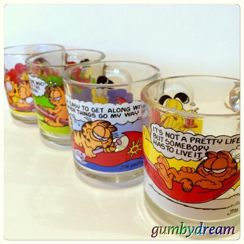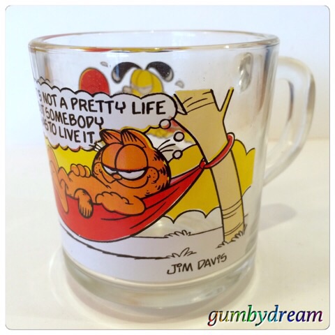 2013/06/27 Category : GARFIELD GARFIELD GLASS MUG "HAMMOCK" / McD 1978-1980 今回のフェニックスのアンティークショップでは、オッさんが探していた物が多く見つかったということでは大収穫。全4種類のうち3種類まで集めていたマクドナルドのガーフィールド・グラス・マグの「ハンモック」を発見したのもその1つです。 1978年から1980年に展開していたこのグラス・マグはファイアー・キングでお馴染みのAnchor Hocking社製。「マクドナルド」「ガーフィールド」「アンカー・ホッキング」というトリプル・ネームのプロダクトですから集めがいがあるというものです。 これまで、あちらこちらのアンティーク・モールで見かけてはいたのですが、10ドル前後の値付けが多かったので無理して買わなかったんです。今回は5ドル以下で入手できましたから、待ってた甲斐があったというものです。 ハンモックに揺られるガーフィールドさんが、”It’s not a pretty life but somebody has to live it”と呟いています。直訳すると意味不明なのでオッさんなりに妄想してみると「素晴らしい人生ってわけじゃないんだけど、誰かがその人生を歩まなきゃならないんだよな・・・」っていう感じでしょうか。 このシリーズが我が家に最初に来たのは2012年のGW。ニューメキシコ州アラモゴードより「シーソーさん」が来日しました。 シーソーに乗るガーフィールドさん そして2012年の夏休みにハワイ島から「スケボーさん」が続いて来日。スケボーに乗るガーフィールドさん 2013年の正月休みにはカルフォルニア州ポモナで「カヌーさん」を発見し、来日ラッシュとなりました。カヌーに乗るガーフィールドさん そして2013年のGWにこの「ハンモックさん」がいらっしゃったわけで、全4種類がニューメキシコ州、ハワイ州、カルフォルニア州、アリゾナ州という全て違うところからいらっしゃったというのも感慨深いですね。記念撮影しておきましょう。 この4種類は安価で見つけたわりにコンディションも良いのでコレクションとして大事に飾っておきますが、今度、どっかで安いの見つけたら買ってきて普段使いにしちゃうっていうのも贅沢ですよね。フフフ。 GARFIELD Character ; ©1978 United Feature Syndicate, Inc. ©2011-2015 GUMBYDREAM Created with flickr badge. http:// PR