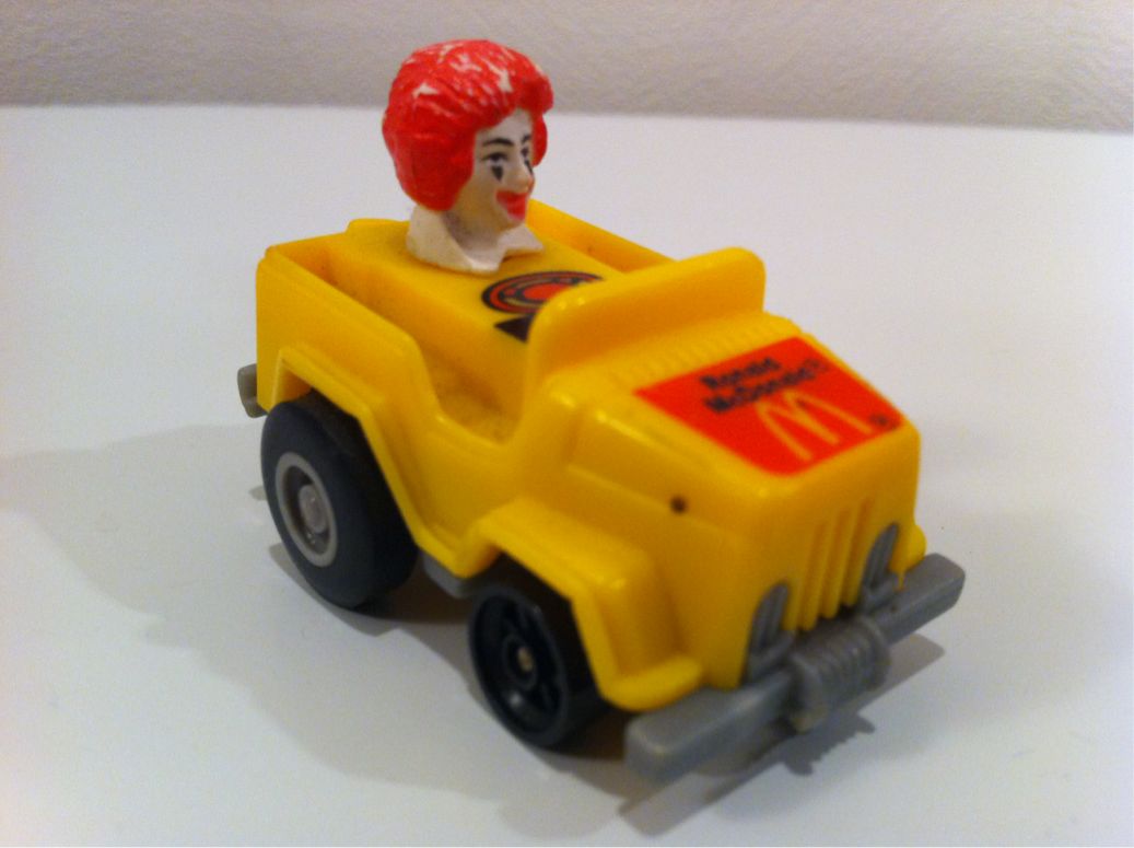 2011/11/10 Category : McDonald's Ronald McDonald In Yellow Jeep 1980s 1985年のMcDonald Happy Meal です。カルフォルニアのアンティークショップからいらっしゃいました。Ronaldが黄色いジープに乗っていて、良く見るとRonaldの顔が男前ですね。少し状態が悪いので、自慢の赤いフサフサの頭髪に白いものが混じってしまっています。これもチョロQみたいに走ります。英語ではPull Back Toy Carというみたいですが、チョロQの方がわかりやすいですよね。裏面にはHPIという表記が何を意味するか定かではありませんが、オッさんはHobby Products Internationalではないかと思ってます。HPI社は四駆を中心としたラジコンメーカーで日本法人もあるんですよ。TweetRonald McDonaldMcDonald©1985HPIAssembled in China ©2011-2015 GUMBYDREAM Created with flickr badge. http:// PR Comment0 Comment Comment Form お名前name タイトルtitle メールアドレスmail address URLurl コメントcomment パスワードpassword