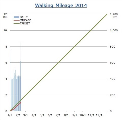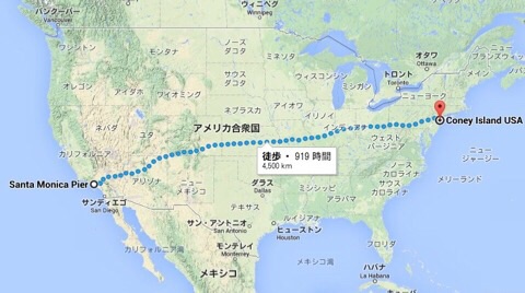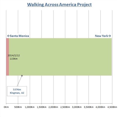 2014/02/12 Category : CALIFORNIA RAISINS The First Four California Raisins "Justin X. Grape" 1987 ラスベガスのAntique Mall of Americaから来日された1987年The First Four California Raisins PVCの”Justin X. Grape”さんです。 そうです。今回の旅で全4体が揃ったのです!こんなラッキーな事はありませんね。1体づつ地道に発見していくのも楽しいのですが、一気に欠けていた方々に出会うというのも感無量。さっそく全4体で記念撮影をしておきましょう。Benさんだけはカルフォルニア&ネバダの混成部隊といったところでしょう。 彼らに出会ったAntique Mall of Americaは人手不足なのかレジのオバちゃんが1人。一生懸命やってくれる良い人なのですが、捌ききれるわけもなく、30分ほどは待たされます。礼儀正しい日本人はジッと待つ美徳をわきまえているので問題ありませんでしたが、旅程がタイトな方は時間の余裕を持って行かれた方が良いと思いますよ。 実はレーズンさん、彼らだけではなく、まだまだ大量の来日となりました。オイオイご紹介していくこととしましょう。レーズン続きだと妻がオッさんのブログを斜め読みしますから、チョイチョイと他の方々の紹介も織り交ぜながら進めたいと思っております。 さて、オリンピック選手が頑張っており、オッさんもWalkingを頑張ろうと宣言いたしましたが、何やら目標を持たなくてはモチベーションが保てません。 Walkingを始めたのは昨年の秋。毎日4km前後を妻と歩き始めたのですが、オッさんの体重はみるみる減っていき、2~3か月後には74kgから68~69Kgまでとなりました。最初のころは体重を減らすのが目的だったし、結果も出てきて面白かったのですが、ここ最近は体重も安定してしまい、ゴルフの飛距離を考えるとこれ以上減らすのも何かなと考える毎日だったわけです。 で、とりあえず、年間目標距離を定める事としました。目標設定は次の式で算出です。1年間の80%、つまり292日は歩こうというものです。 365日 × 80% × 4km/日 = 1,168Km/年≒ 1,200km/年。 毎日のWalkingの距離はアイフォーンのRuntasticというAPPがGPSを使って測定してくれますから、記録していくことも簡単です。とりあえず、昨日までの距離をエクセルでグラフ化してみました。緑の目標ラインに対して赤い実績ラインということですので、少し目標に足りないペースであることがわかります。まぁ1月は旅行に行っていたり何やかんやで歩く日が少なかったですから。残り10か月ちょっとで挽回は可能なペースと判断しています。 しかしながら「年間1200Km歩いたから何だっていうのか?」というモヤモヤ感がありますね。もうちょっと高い目標を立ててみることにしました。日本列島縦断3000Kmというのも考えましたが何かシミったれた感じでワイルドではありません。 で、思いついたのが「アメリカ横断プロジェクト」。グーグル・マップで徒歩のルート検索したら、何と4,500kmあるではないですか!目標としては申し分ない手の届かなさです。ちなみに出発地点はカリフォルニア州のサンタモニカ埠頭で、到着点はニューヨーク州のコニー・アイランド。どうですイカす目標でしょ? で、自分がどこまで歩いているのかを目で確認できるように、これまたエクセルで目標管理グラフを作ってみました。昨日時点での歩行距離は115Kmで、まだLA近郊といったところ。当面はRoute66の聖地、アリゾナ州キングマンを目指すこととします。そうです、年末年始の旅行で訪れたところです。順調に行けば2014年のGW前後にはキングマンに到着するのではないでしょうか。毎月末には進捗状況をレポートしていきたいと思います。 ちなみにアメリカ横断4,500kmを歩ききるにはどのくらい時間が必要なのでしょうか?年間1200Kmのペースとして、3年半~4年くらいかかる計算です。2017年の秋っていう感じでしょうか。オッさんはその時50歳になっています。ヒエ~。 「妻とともに目標を達成する」と言いたいところですが、妻はあれやこれやと歩かない日がありますので、オッさんの2/3程度じゃないでしょうか?2/3ということはオッさんがニューヨークの到達しているころ、まだインディアナ州からオハイオ州あたりをウロウロしてることになるのではないでしょうか?まぁそれでも立派なもんです。 今日のオリンピック観戦は男子ノルディック複合。ラストでまくられちゃいましたが、渡部選手、素晴らしかったですね。解説の荻原健司さんのハイテンションぶりもサッカーの松木さんみたいで良かったです。©1987 CALRABMADE IN CHINA ©2011-2015 GUMBYDREAM Created with flickr badge. http:// PR Comment0 Comment Comment Form お名前name タイトルtitle メールアドレスmail address URLurl コメントcomment パスワードpassword