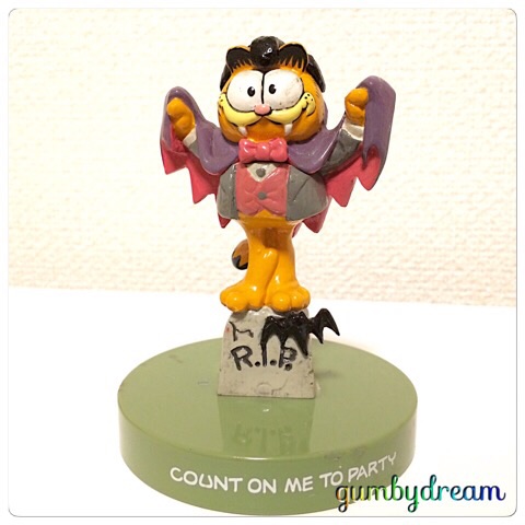 2014/10/26 Category : GARFIELD Ceramic Vampire Dracula Garfield 1980s そろそろハロウィンですので関係者の方々の紹介をいたしましょう。今年のトップ・バッターはドラキュラ伯爵のコスプレをしたガーフィールドさんです。今年の新年旅行で訪れたLas VegasのCharleston Antique Mallからいらっしゃいました。詳しく観察してみましょう。まずはお顔周辺。ドラキュラ伯爵なのでキバがちゃんと付いてます。しかし伯爵風のズラはいかがなものでしょうかね。塗装の荒さも残念ポイントです。ガーフィールドさんが立っているのはR.I.Pと書いてあるので墓石でしょう。R.I.Pとは”Rest In Peace”の意味。”Mr.○○ R.I.P"というふうに墓石に刻まれる事が多く、「○○さん、安らかにお眠りください」的なものです。台座には”COUNT ON ME TO PARTY”、「パーティーに連れていって」と書かれています。恐らく1980年代のプロダクトで製造はEnesco Imports社。この会社は1958年にN. Shure Companyの輸入部門が独立してできた会社。N. ShureのNとSを取ってN.S Corporation=NSCOとするところをEを混ぜてeNeSCOとしたそうです。現在もギフトウェア製造会社、Enesco, LLCとして存続しています。さて、今日はゆっくり起きて塩釜方面へドライブ。訪れたのは塩釜神社。200段ちょっとの石段も山寺に比べたらかわいいもんです。北上して松島へ。観光地ですので人がたくさんの松島ですが、少し離れれば静かなところもあるんですよ。仙台方面に戻って七ケ浜も。今日は海沿いウロウロコースです。夕食は自宅で頂き物大会。まずは山形「つや姫」の新米を酒田の塩鮭と米沢牛のしぐれ煮で。いやぁまずいです。ご飯食べすぎちゃいます。食後は秋田の方にいただいた幻の梨「かおり梨」。これ、妻の顔くらいある巨大梨なんです。しかし大味ということではなく、すごくみずみずしくて美味しいんですよ。栽培が難しく栽培量が少ないので「幻」と呼ばれているそうです。いやぁ東北の美味しい物を頂けて、なんて贅沢なんでしょうね。東京にいたらこうゆうわけには行きません・・・・。まだまだ季節の美味しい物を探していこうと思います。GARFIELD 1978,1981UNITED FETURE SYNDICATE, INC.LICENSEE ENESCO IMPORTS CORPMADE IN CHINA ©2011-2015 GUMBYDREAM Created with flickr badge. http://